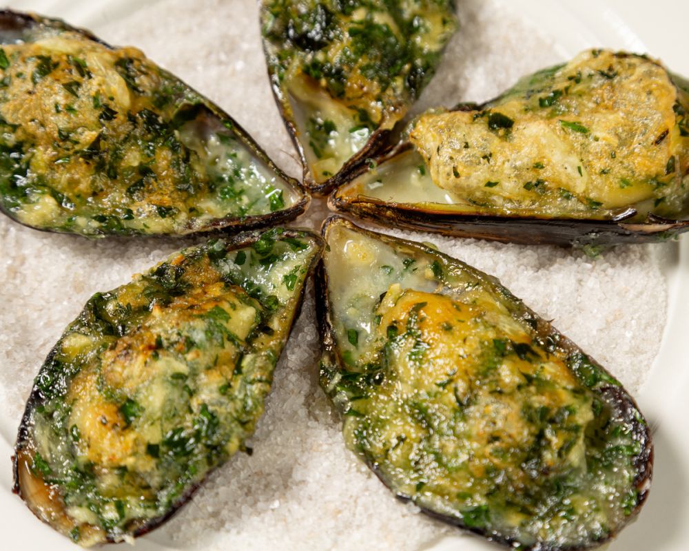 Максимальная температура ускоряет карамелизацию сыра, а плотные мидии не теряют сочности. Камамбер создаёт мягкую кремовую окантовку, которая гармонирует с солоноватостью рыбы и кисло-лимонной ноткой лайма.