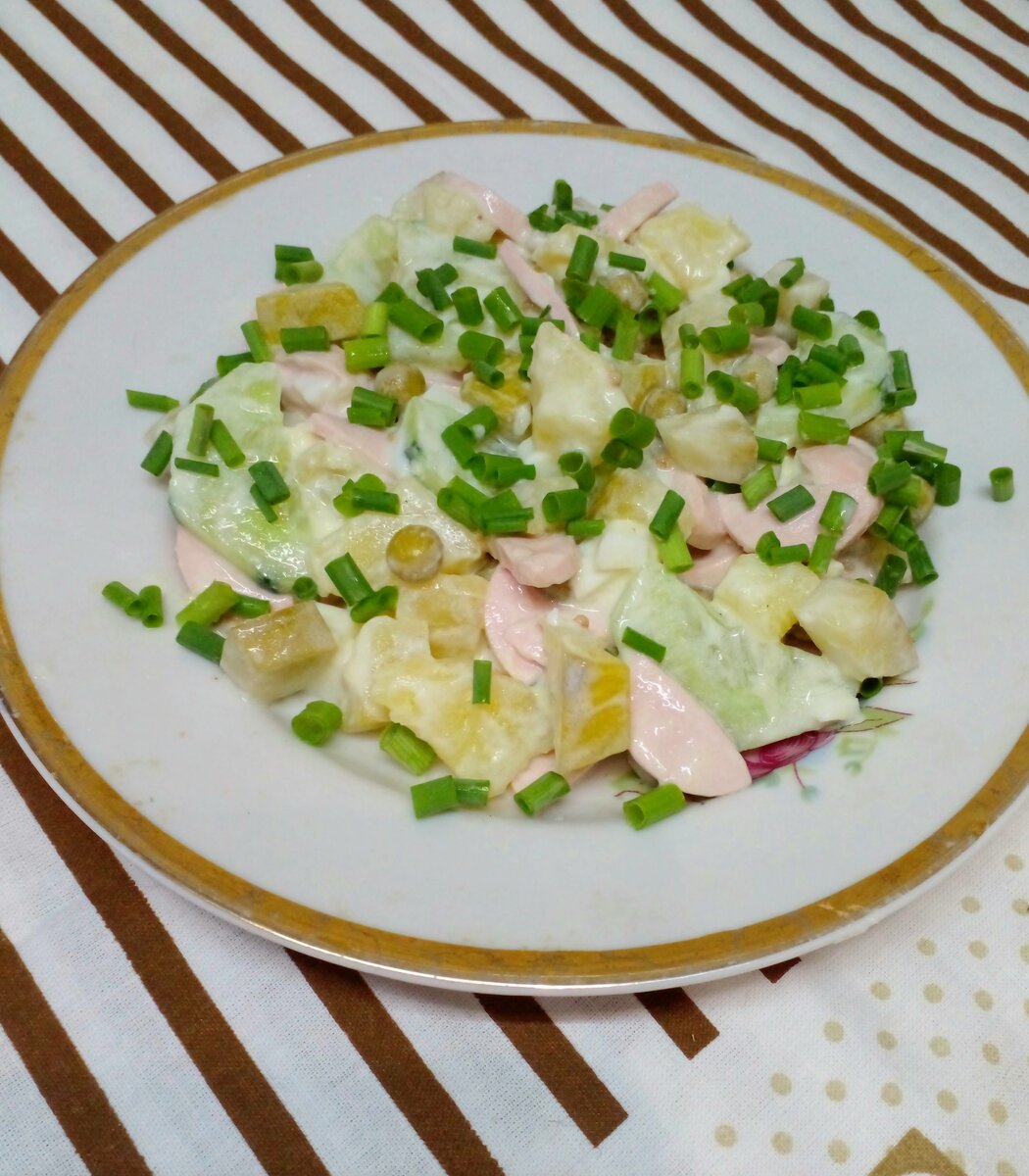 Сосиски достаточно отварить в течение 3 минут и нарезать полукружиями. Картофель, отваренный в мундире, остужается и нарезается кубиками, а свежий огурец — полукружками. Вареные яйца также следует нарезать кубиками.