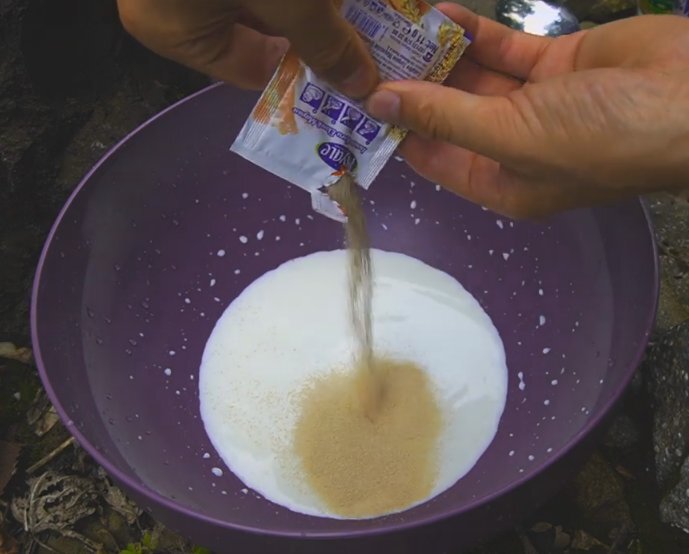 1. В отдельной емкости тщательно смешать молоко и сухие дрожжи, добавить сахар и перемешать до полного растворения.