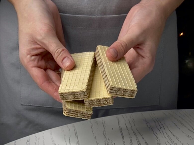 Для начала потребуется блендер. Вафли помещаются в чашу и взбиваются до состояния мелкой крошки. Если блендера нет, можно воспользоваться мясорубкой — она также справится с этой задачей.