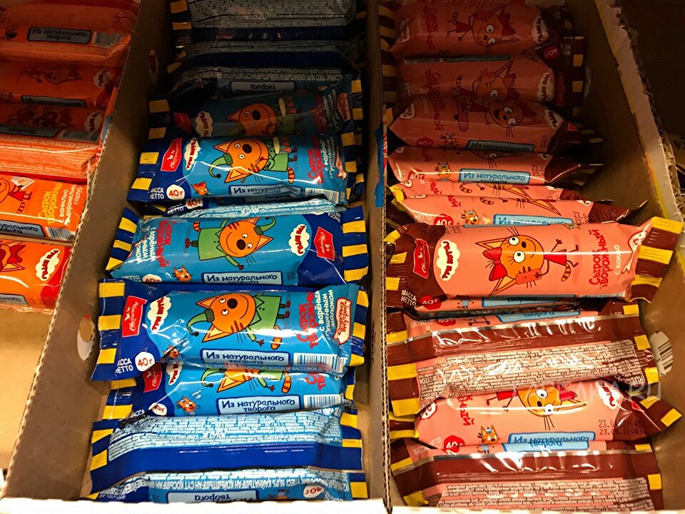 - Творожный сырок "Три кота" - производитель "Свитлогорье", 40 г, 22,90 руб. В составе присутствует пальмоядровое масло.