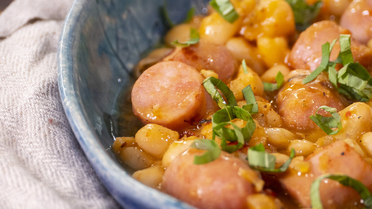 Тем временем, оставшуюся половину луковицы мелко нарезать и обжарить с оливковым маслом до прозрачности. Томат нарезать кубиками, а перец чили обсечь ножом. Колбаски нарезать и вместе с чили добавить в сковороду с луком. Затем добавить дроблёный перец, мелко нарезанный чеснок, тимьян и копчёную паприку, а также чуть муки для связывания. Тщательно перемешать, добавить томат и предварительно приготовленную фасоль (лук вытащить). Влить немного бульона и тушить около 5-7 минут. Не забудьте вынуть лавровый лист перед подачей на стол!
