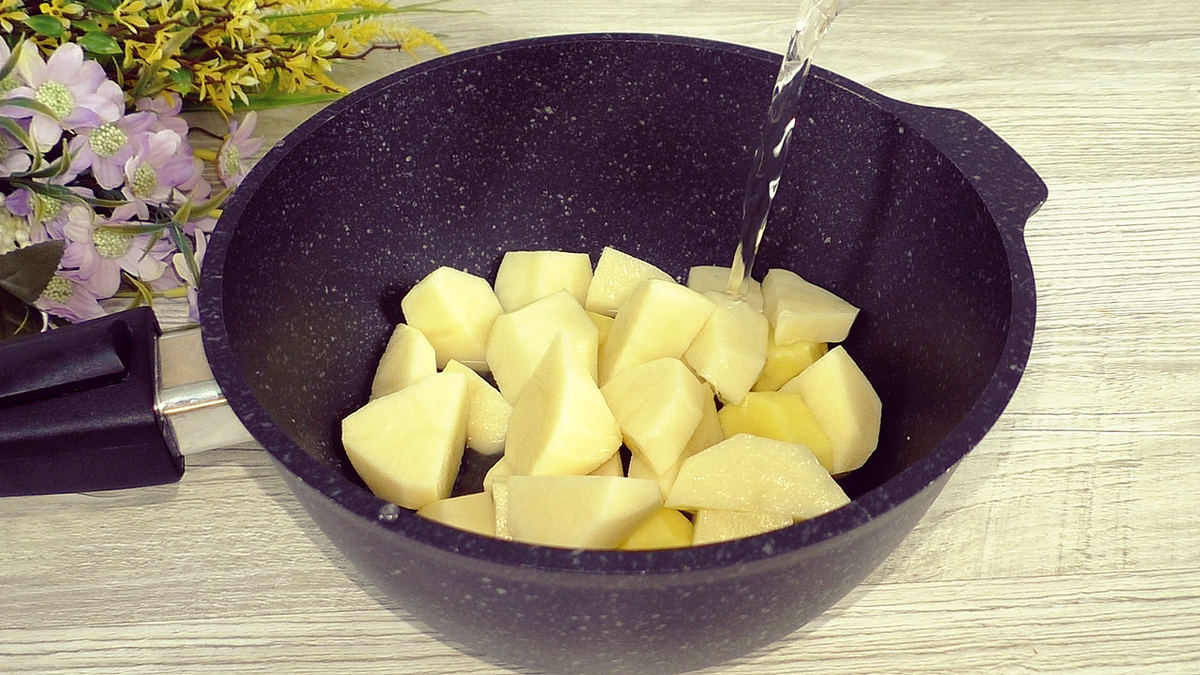 Сначала необходимо очистить и нарезать 350 г картофеля небольшими кусочками, чтобы он хорошо сварился. Затем залить картошку 350 мл воды и варить до полной готовности.