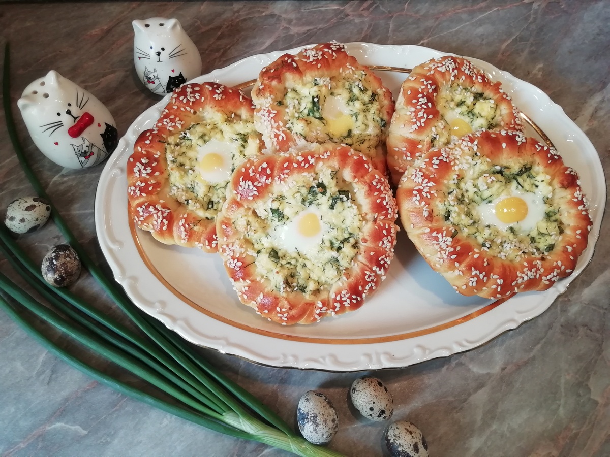 Получившиеся ватрушки нужно разместить на противне, выстланном бумагой для выпечки, и наполнить каждую столовой ложкой начинки. Накрыть полотенцем и оставить на 15-20 минут для подъема. Затем края ватрушек нужно смазать взбитым яйцом и посыпать кунжутом.