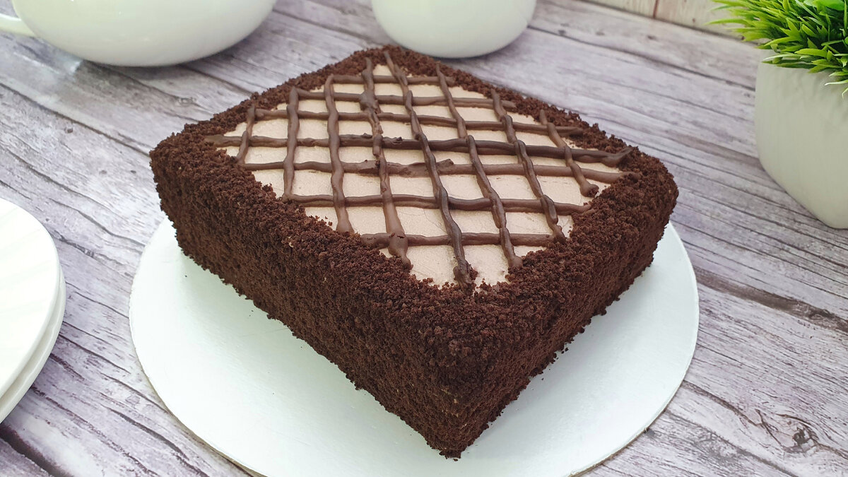 Соберите торт, пропитывая каждый корж и промазывая кремом. Обсыпьте боковые части бисквитной крошкой. Растопите шоколад с молоком в микроволновке или на водяной бане и, используя кондитерский мешок, украсьте верх торта. Уберите его в холодильник для пропитки на ночь.