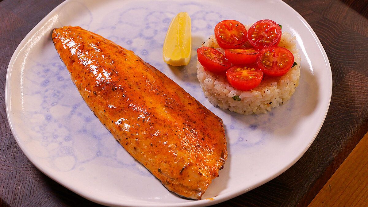 Для украшения можно обжарить помидоры черри на газовой горелке и снять с них кожицу. На тарелку разместите рыбу и рис, украсьте очищенными томатами. Если хотите добавить немного аромата, пройдитесь газовой горелкой и по рыбе. Приятного аппетита!
