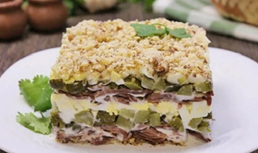 Сборка салата — ключ к его великолепному вкусу. Ингредиенты выкладываются слоями: отварной картофель, огурцы, говядина с соусом, лук и щедрая порция орехов и зелени. Подавайте сразу, пока говядина еще теплая, а огурцы хрустят.