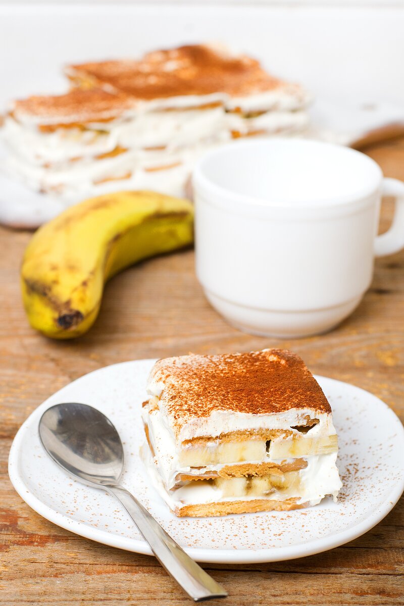 5. Повторите все слои (печенье, сметана, банан) несколько раз. На верхний слой добавьте только сметану, а затем посыпьте его какао-порошком через ситечко.