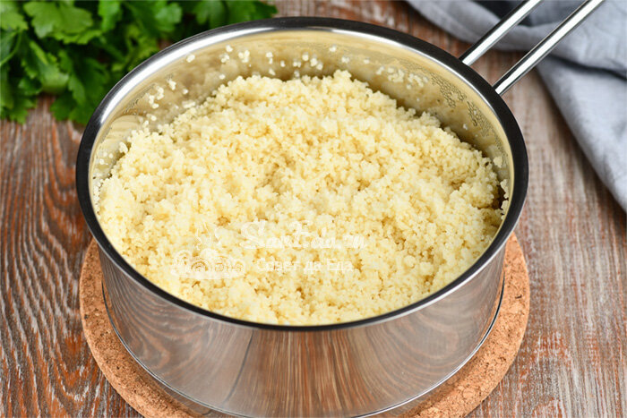 1. Для начала, необходимо отмерить кускус. Эта крупа не требует тщательной подготовки – промывать ее нет смысла, иначе она может слипнуться. Одного стакана (250 мл) хватает на 180 г кускуса. Достаточно будет залить кипятком на 5 минут, и готово!