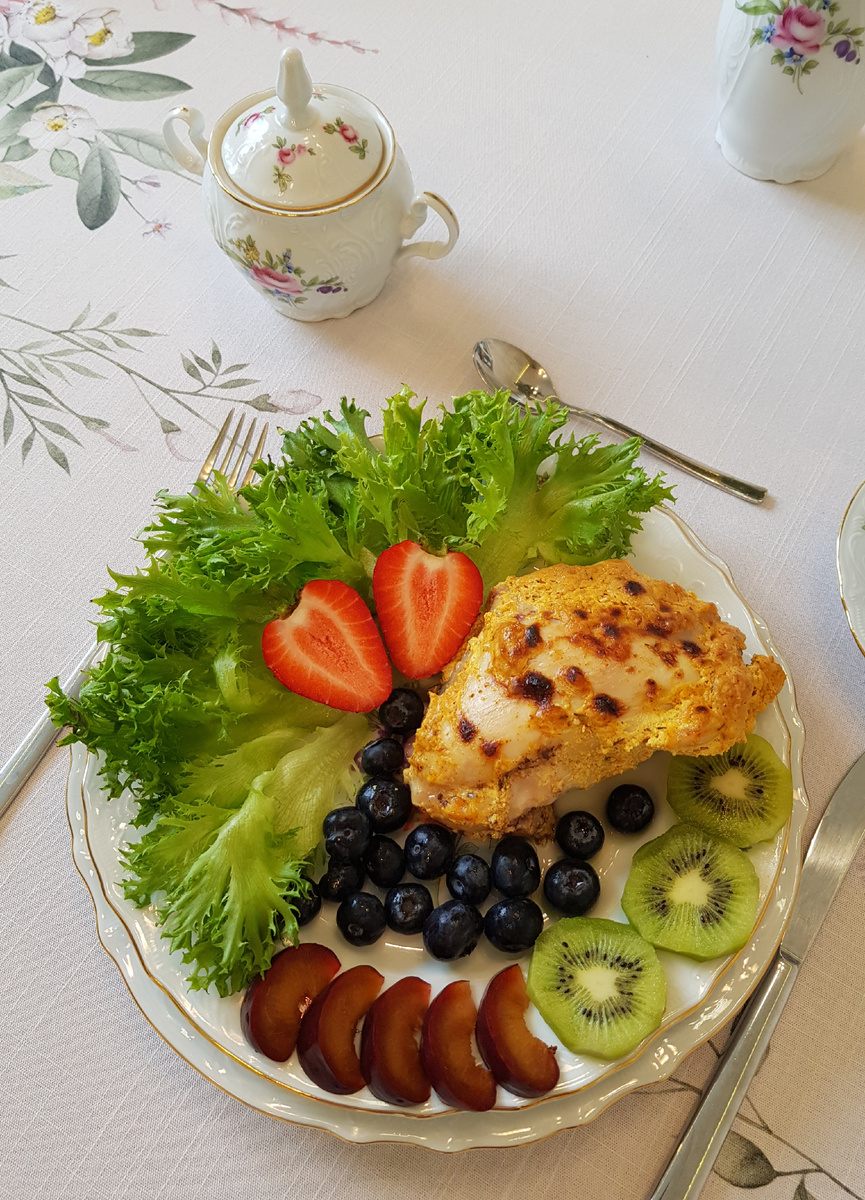 После завершения запекания аккуратно разложить куриные кусочки по тарелкам, дополнить свежими листьями салата и сезонными ягодами для яркости и свежести.