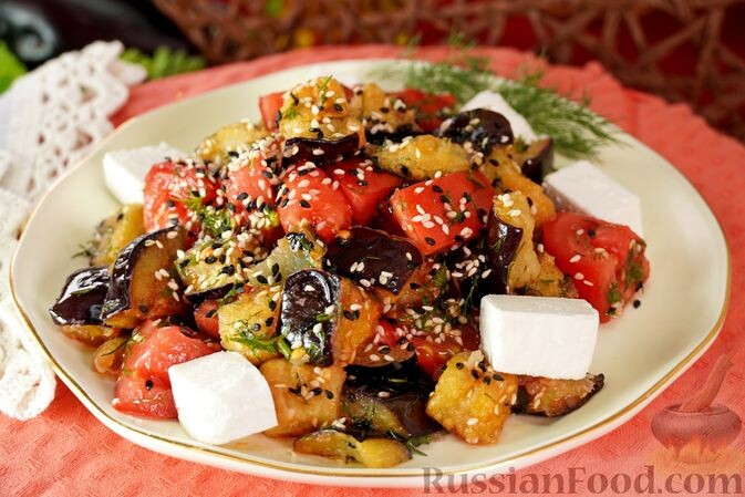 - Салат с хрустящими баклажанами, помидорами и фетой— это яркое сочетание текстур и вкусов. Баклажаны обжариваются в крахмале до золотистой корочки, помидоры добавляют воды, а фета придаёт сливочную нотку, создавая сытное блюдо.