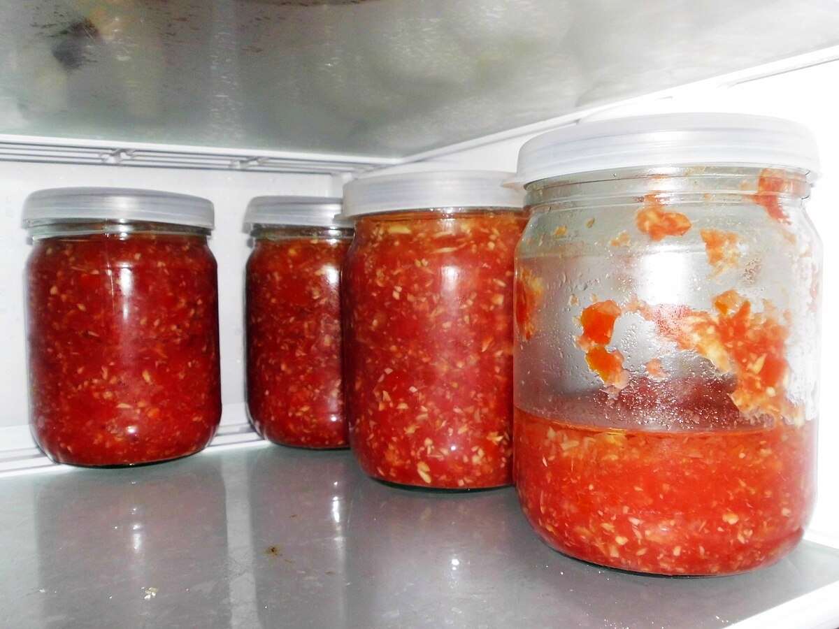 Приготовление: помидоры измельчить, чеснок и хрен натереть на терке. Все смешать, добавить соль и сахар, разлить по банкам и оставить на сутки в холодильнике.
