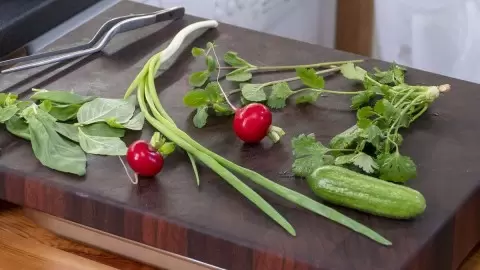 После того как кускус запарился, можно переходить к овощам. Редис и огурец нарезать тонкими кружочками, предварительно замачивая редис в ледяной воде для нейтрализации горечи. Порезать зеленый лук, оторвать листья мяты и крупно нарезать кинзу. Для базилика – скрутить листики и нарезать.