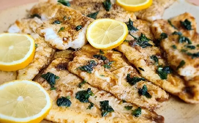 Теперь разогрейте сковороду с оливковым маслом, добавьте половину сливочного масла и обжаривайте рыбу на слабом огне с обеих сторон по 5 минут. Затем добавьте оставшееся сливочное масло и переведите рыбу на отдельную тарелку.
