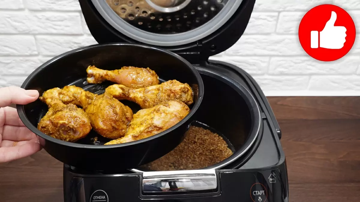 Пока курица настаивается, в чашу мультиварки добавьте предварительно промытую гречку, посолите и залейте холодной водой. Куриные голени выложите в корзину для пароварки и затем установите её в мультиварку.