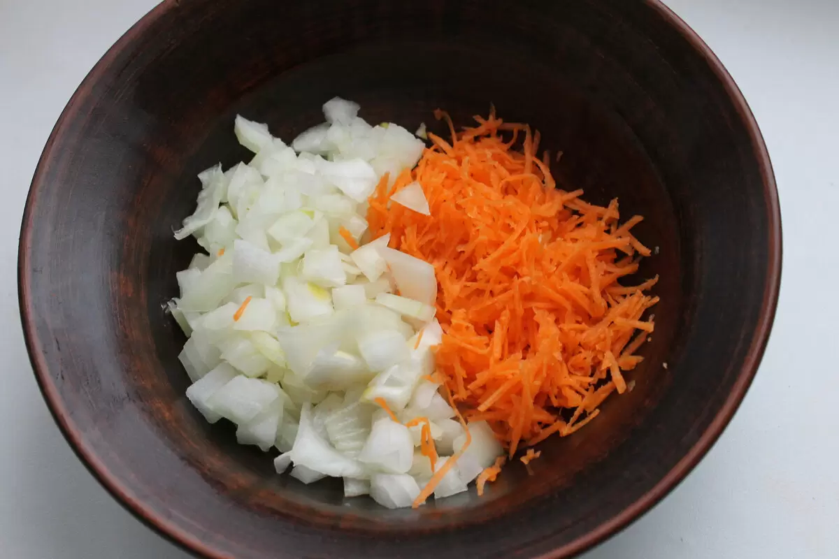 Для начала стоит разогреть духовой шкаф, затем натереть морковь и лук, порезать помидор. Фарш следует смешать с овощами и приправами, чтобы увеличить вкусовые качества начинки.