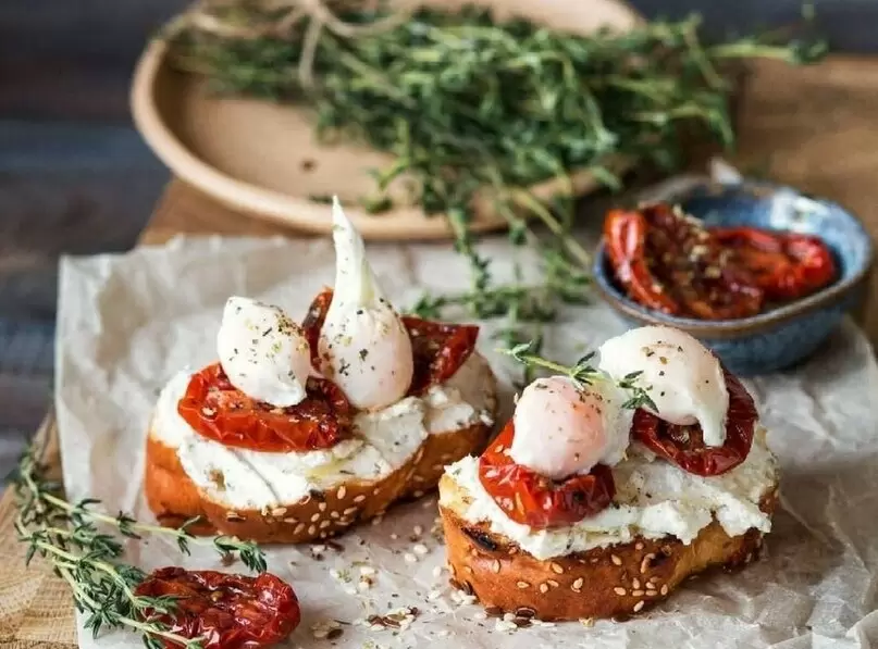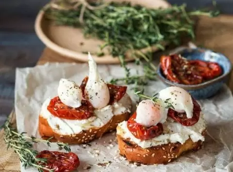 Готовые тосты щедро намажьте предварительно подготовленным творожным кремом. Сверху выложите вяленые томаты и по одному перепелиному яйцу-пашот. Для завершения украшения используйте свежую зелень — это придаст вашему блюду особую нотку.