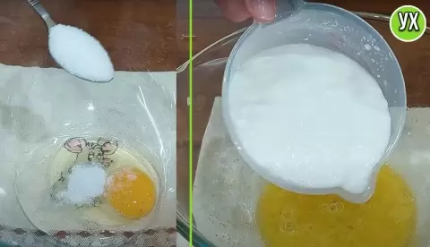 1. Начинается все с подготовки теста. В глубокой миске разбивают яйцо, добавляют соль и сахар, затем тщательно взбивают венчиком. Вливают кефир и перемешивают. Все компоненты должны быть комнатной температуры.