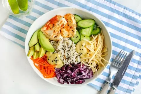 Заправка и сборка боула — В блендере смешайте кешью, оливковое масло, горчицу, лимонный сок, соль и перец. В готовую миску выложите теплый рис, замаринованные овощи, огурцы, авокадо и запеченный тофу. Полейте ароматной заправкой и наслаждайтесь уютным ужином!