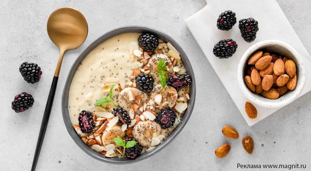 - Смузи-боул с бананом, ежевикой, семенами чиа и миндалем;