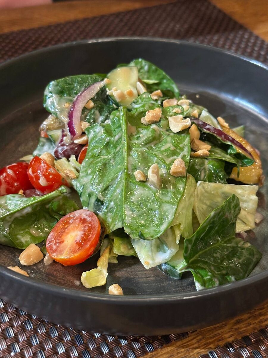 - Зелёный салат с тофу — свежий и лёгкий вариант, сочетающий зелень и хрустящий панированный тофу.