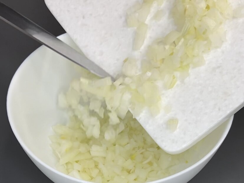 Для начала необходимо подготовить два крупных лука и нарезать их кубиками – это самый трудный шаг в нашем рецепте. Затем в миске соединяются два яйца и немного соли. Для большей сочности можно предварительно «помять» лук с солью, чтобы он дал сок, а лишь потом добавить яйца.