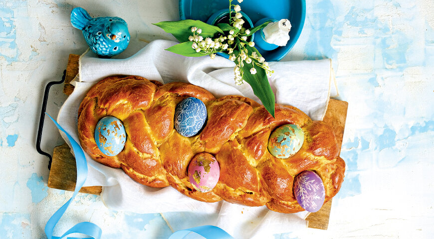 Шаг 3: Разогрейте духовку до 190 °C и выпекайте косичку на среднем уровне в течение 35 минут. После выпечки переложите на деревянную доску, охладите. Выньте вареные яйца и замените их на крашеные.