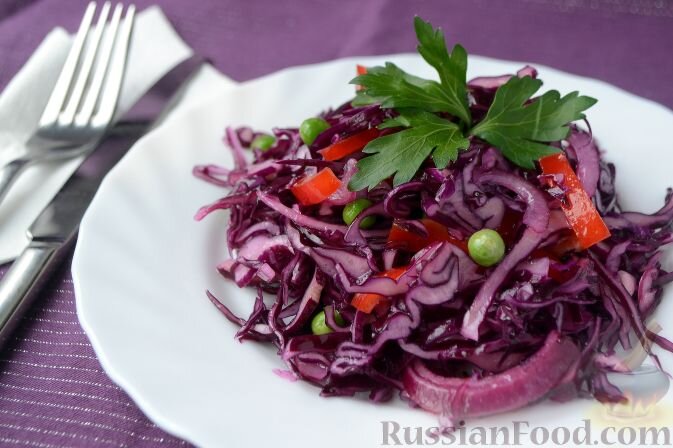 Попробуйте также салат из краснокочанной капусты с болгарским перцем и зелёным горошком. Это компактное и легкое блюдо не только отлично смотрится на тарелке, но и является настоящей находкой для тех, кто следит за своим питанием.