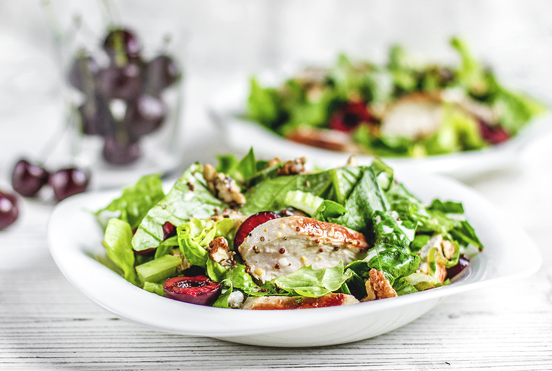 Шаг 2: В глубокой миске выжимается сок из лимона, добавляются йогурт, горчица и мёд – всё тщательно перемешивается. Сельдерей нарезается, грецкие орехи очищаются от скорлупы и измельчаются. Черешня делится пополам, удаляя косточки. В салатной миске смешиваются листья салата, куриные ломтики, орехи, сельдерей и черешня, а затем всё щедро заправляется приготовленным соусом. Рекомендуется подавать салат тёплым, чтобы все ароматы полностью раскрылось.