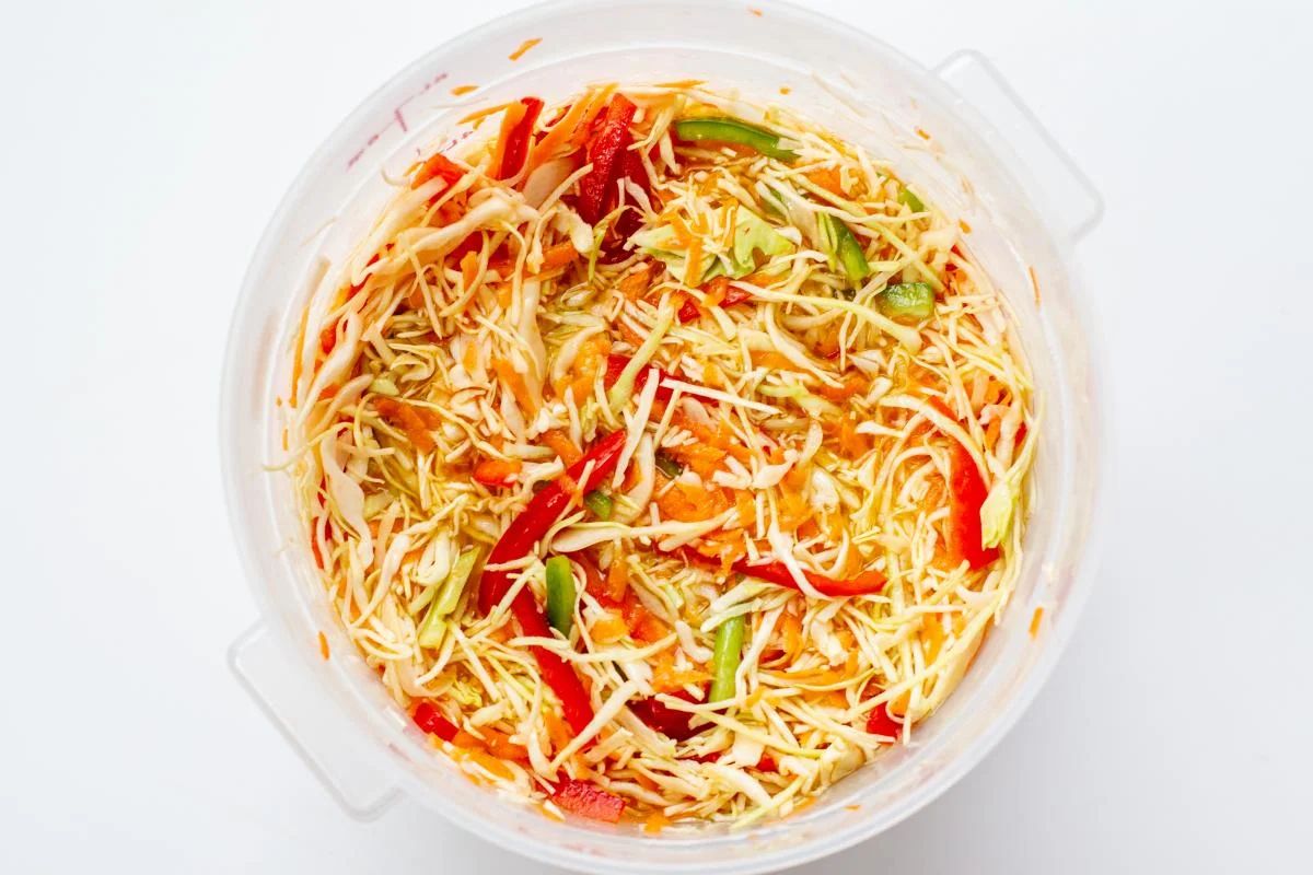 Начините с подготовки овощей: нашинковать капусту, потереть морковь и нарезать перец. Затем объедините все ингредиенты в большом емкости.