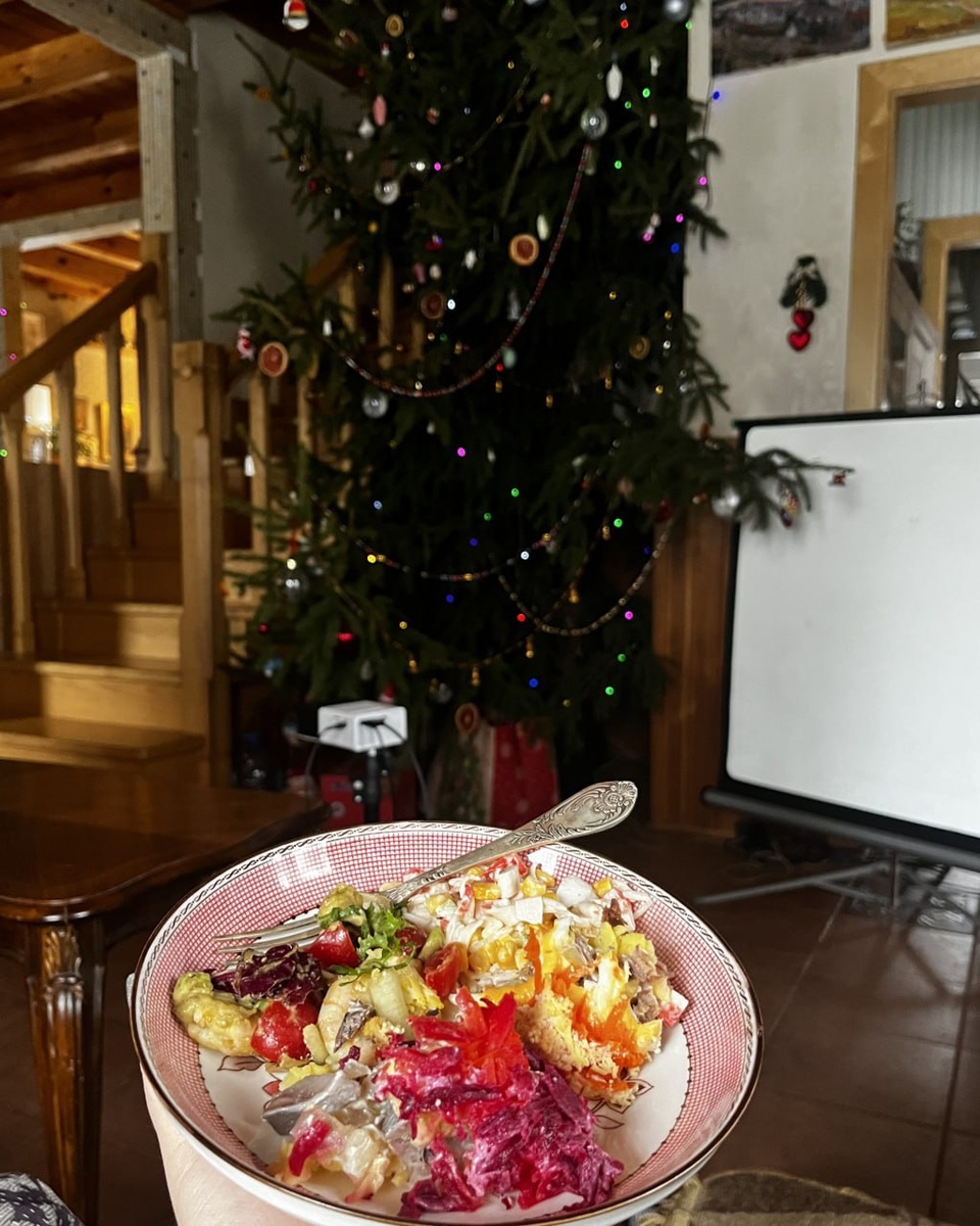 На фото: 1 января 2025 года — полный набор для новогоднего застолья: свежие салатики и нарядная ёлочка привносят атмосферу праздника.