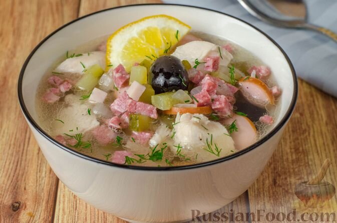 Если вы ищете что-то необычное, попробуйте это «белое» первое блюдо. В нём гармонично сочетаются несколько видов колбасы и куриное мясо с солёными огурцами и маслинами, придающими блюду яркий вкус даже без томатной пасты.