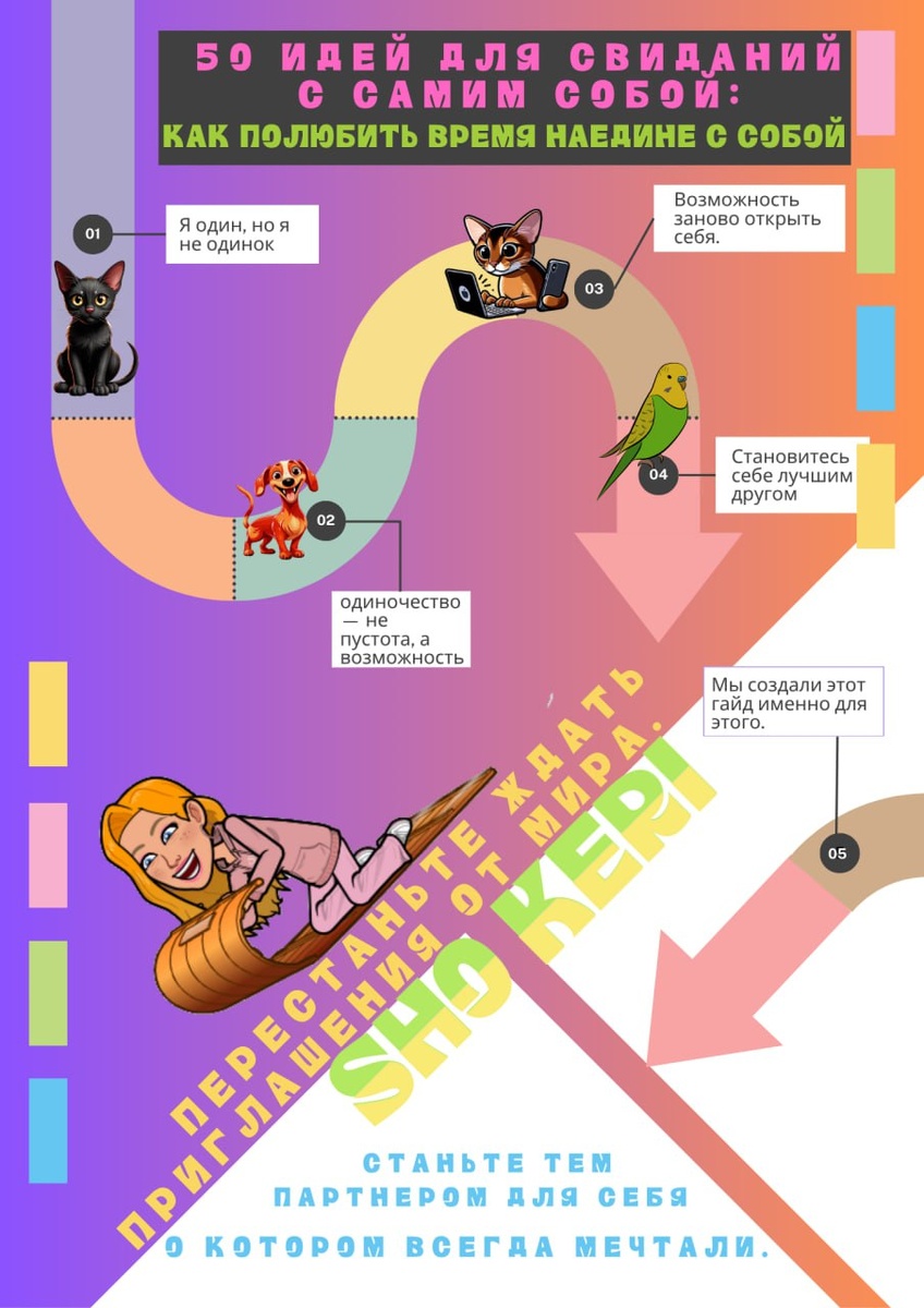 Рады представить вам цифровой гид под названием «50 идей для свиданий с самим собой». Этот ресурс является настоящим кладезем оригинальных и разнообразных предложений, которые не оставят вас равнодушными.
