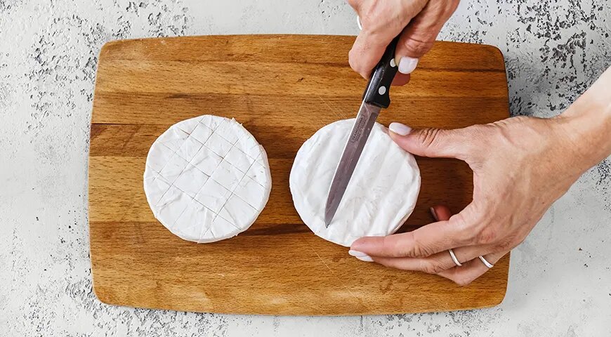 Первым делом стоит достать камамбер из упаковки. Чтобы создать красивую эстетическую презентацию, стоит сделать несколько надрезов в виде решетки по поверхности сыра. Это позволит ему лучше расплавиться и пропитаться ароматами.