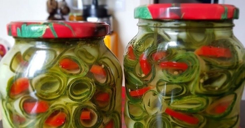 Сначала огурцы тщательно моются, после чего обрезаются кончики и, по желанию, очищаются от кожицы. Далее их нарезают вдоль тонкими ломтиками с помощью овощечистки или слайсера. Перец следует нарезать тонкой соломкой. Можно также добавить натертую на корейской терке морковь для разнообразия.