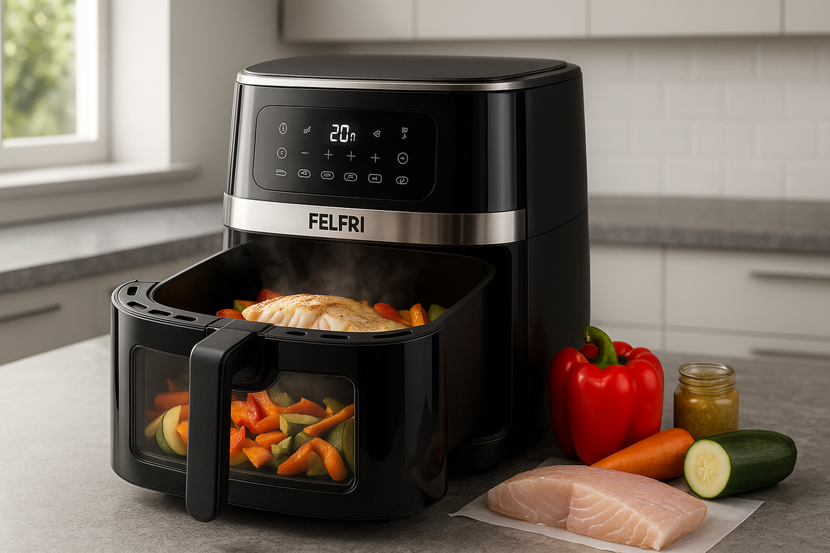 Аэрогриль FELFRI имеет множество преимуществ: он быстро и равномерно нагревает чашу, оснащен 12 автоматическими программами, поддерживает диапазон температур от 80 до 200 °C и предлагает таймер и удобное электронное управление. Защита от перегрева и специально разработанные аксессуары делают готовку безопасной и удобной.