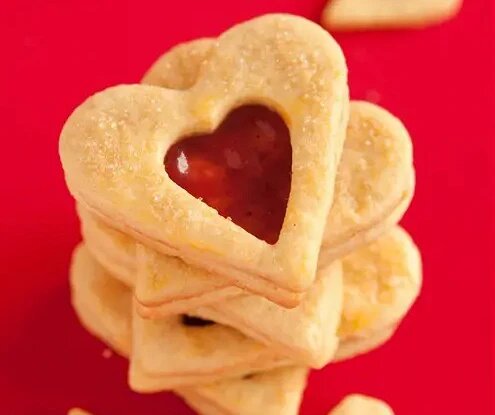 В глубокой миске объединить муку, сливочное масло, сахар, яйцо и щепотку соли. Для этого муку стоит просеять в виде горки на рабочую поверхность. В центре образоваться углубление, в которое положить сахар и яйцо. Вокруг аккуратно нарезать холодное сливочное масло и измельчить всё ножом до состояния крошки. Затем быстро замесить тесто руками.Замотать тесто в пленку и убрать в холодильник на час.После охлаждения тесто раскатать в тонкий слой, используя формочку в виде большого сердца, вырезать печенье. В половине заготовок сделать выемку маленьким сердечком. Поверхность смазать яичным желтком и посыпать крупным сахаром. Выпекать в предварительно разогретой до 200 градусов духовке в течение десяти минут. Затем на целые печенья намазать клубничный конфитюр и накрыть фигурками с вырезами.Печенье готово порадовать не только вас, но и ваших близких. Попробуйте, и это лакомство займет достойное место в вашем меню!
