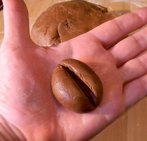 3. Отделите от теста небольшие кусочки и сформируйте из них шарики. Немного вытяните их, придавая форму кофейных зёрен.