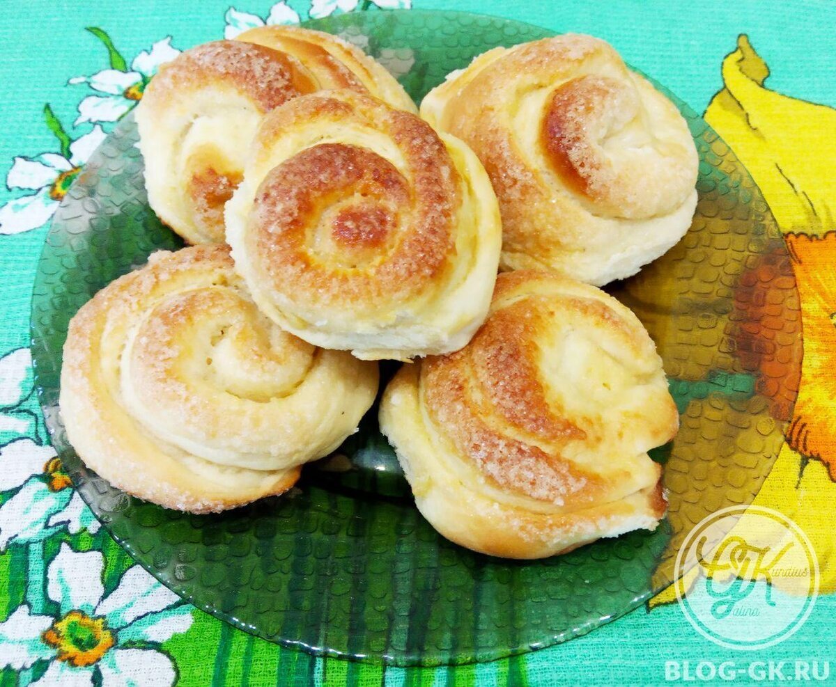 Перед выпечкой смазать яйцом и присыпать сахаром. Выпекать при температуре 200°C до румяной корочки. Остывшие булочки подавать к чаю.