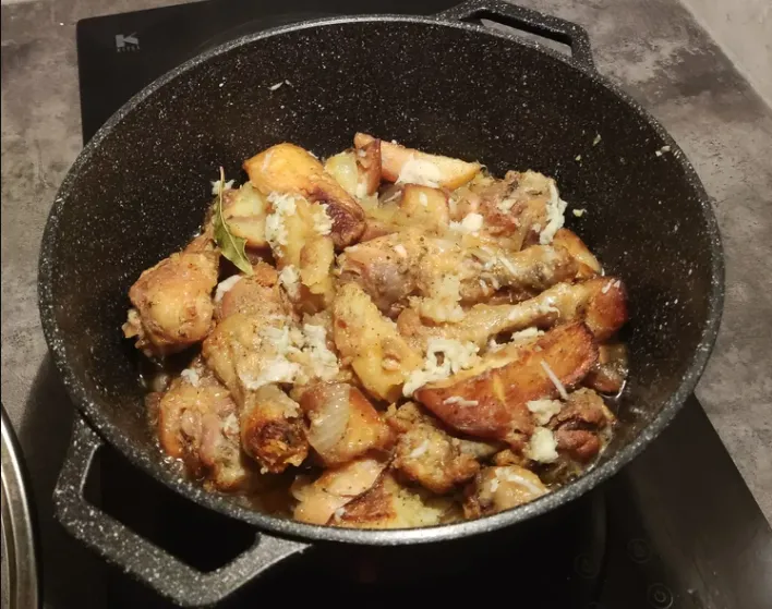 После обжаривания вернуть кусочки курицы обратно в сковороду или казан. Каждый слой стоит пересыпать заранее приготовленной чесночной смесью, чтобы каждый кусочек был пропитан ароматом.