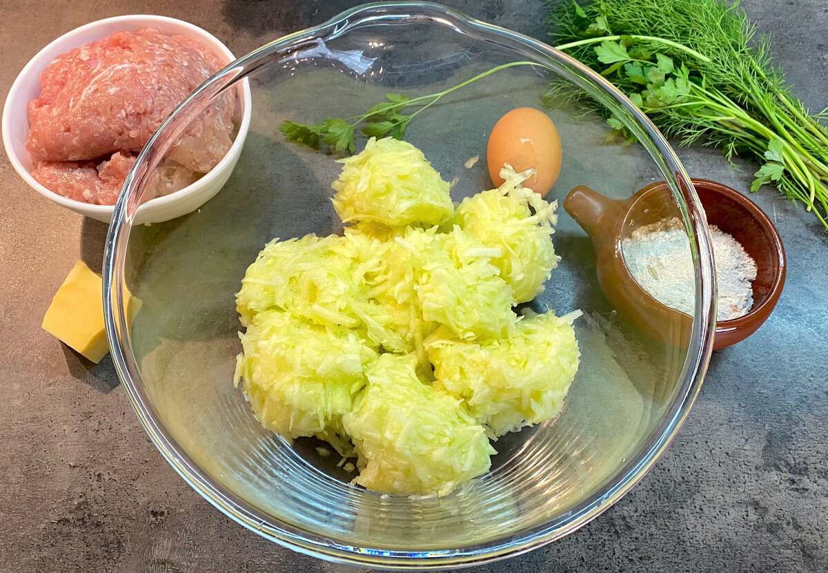 - Первоначально необходимо натереть свежий молоденький кабачок. Чистить не требуется, важно только хорошенько отжать натертую массу, чтобы основа была более плотной.