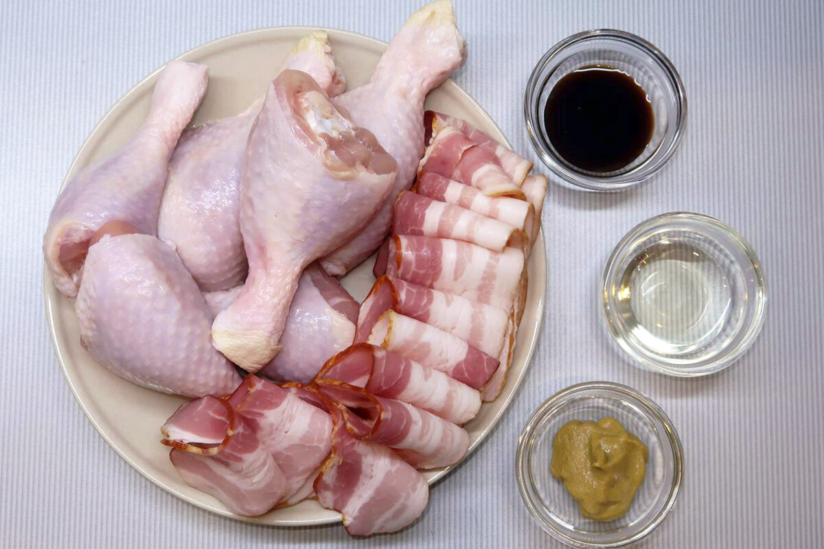 Когда куриные голени достаточно замариновались, их нужно завернуть в ломтики бекона — по два тонких куска на каждую ножку, чтобы добиться максимального эффекта хрустящей корочки.