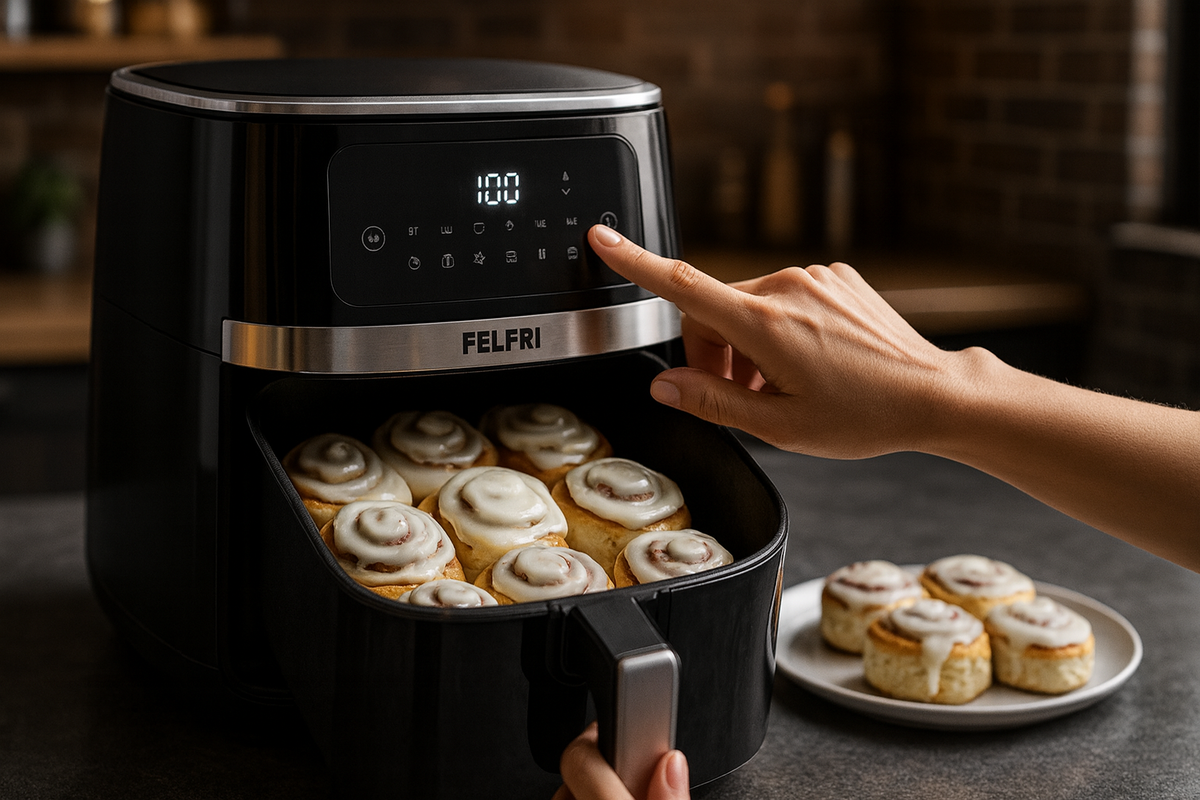 Рекомендуемая модель: аэрогриль FELFRI мощностью 2200 Вт с двенадцатью программами — отличный помощник для равномерного прогрева и идеального результата.