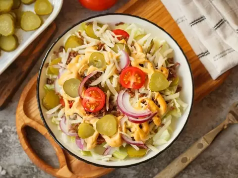Невероятно аппетитное и полезное блюдо – салат «Бургер» без обычной булочки. Сочетание ароматного мясного фарша, свежих овощей и расплавленного сыра вызывает слюноотделение с первой минуты. Это идеальный выбор для тех, кто хочет порадовать своих близких вкусным угощением, настроенным на здоровый образ жизни.