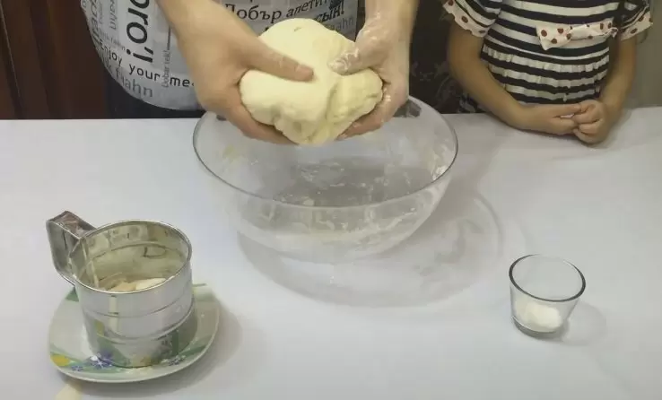 Тем временем готовится тесто. В отдельной миске смешиваются вода и соль, затем постепенно добавляется мука, и замешивается крутое тесто, которое затем рекомендуется оставить в холодильнике на 30 минут для отдохновения.