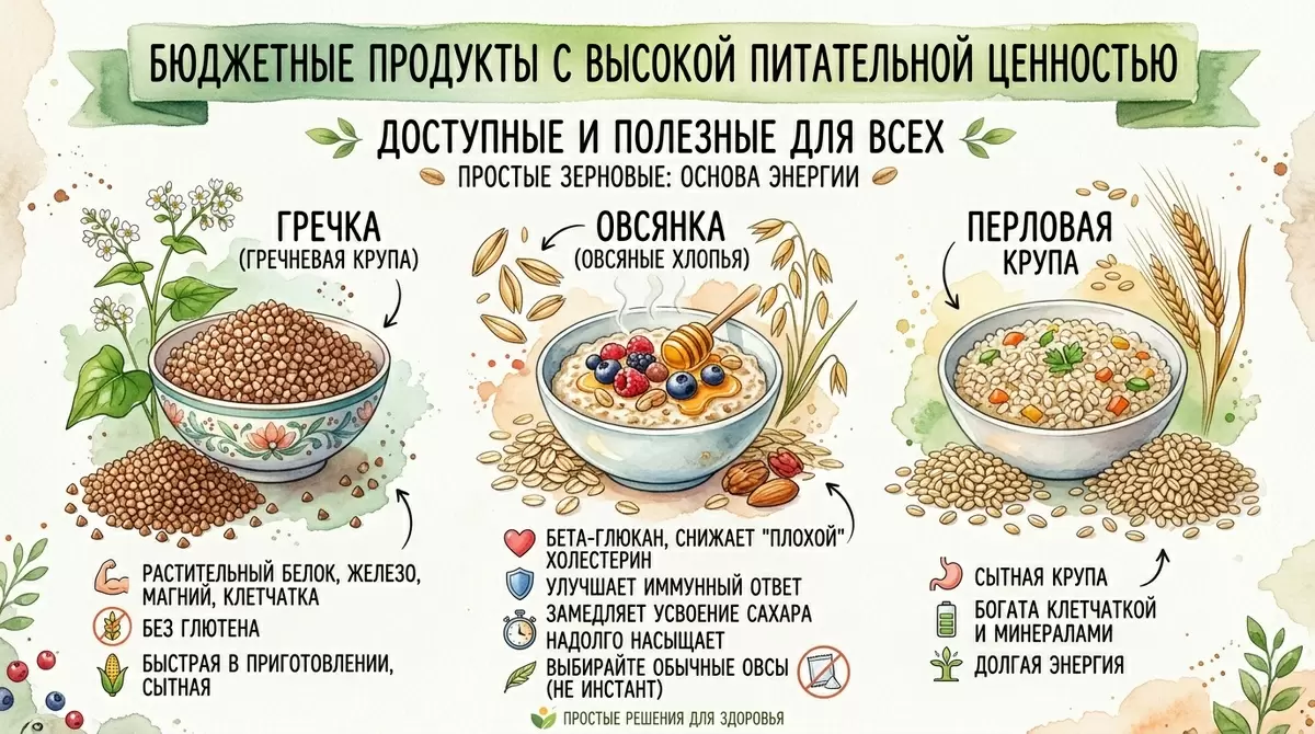 Гречка и овсянка — это идеальные примеры доступных и питательных продуктов. Например, гречка содержит белок, клетчатку и минералы, а овсянка — полезные волокна, снижающие уровень холестерина.