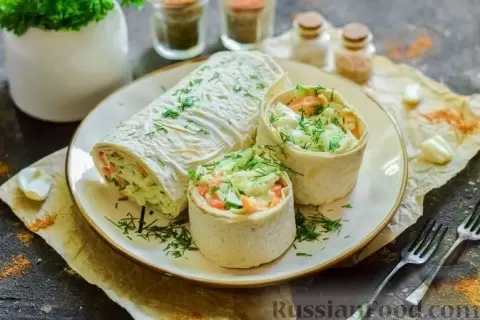- Лаваш с капустой, перцем и огурцом — легкое и освежающее блюдо, которое сполна раскроет вкус свежих овощей.