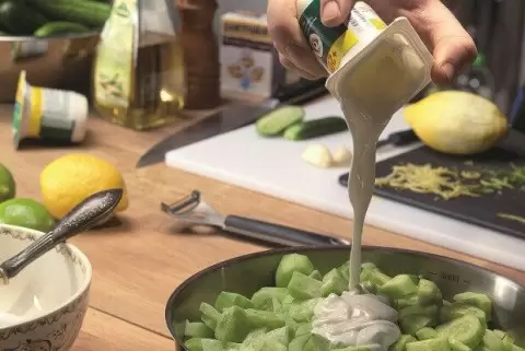 2. Смешивание ингредиентов: В ту же миску добавьте натуральный йогурт, ранее сорванные листья мяты, мелко нарезанный чеснок, три столовые ложки винного уксуса и натертую цедру лимона. Лимон без цедры можно использовать в любом другом блюде, требующем его сока.