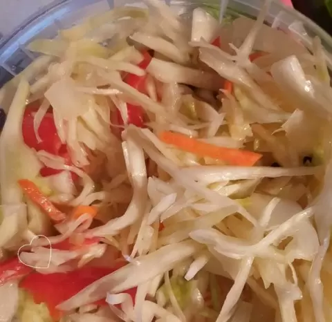 - Чтобы приготовить, нашинкуйте капусту, добавьте соль и немного помните, чтобы она пустила сок. Затем нарежьте остальные овощи и добавьте их в миску с капустой. Полейте уксусом и маслом, добавьте перец, тщательно перемешайте. Дайте настояться несколько часов при комнатной температуре, а потом разложите в банки и храните в холодильнике.