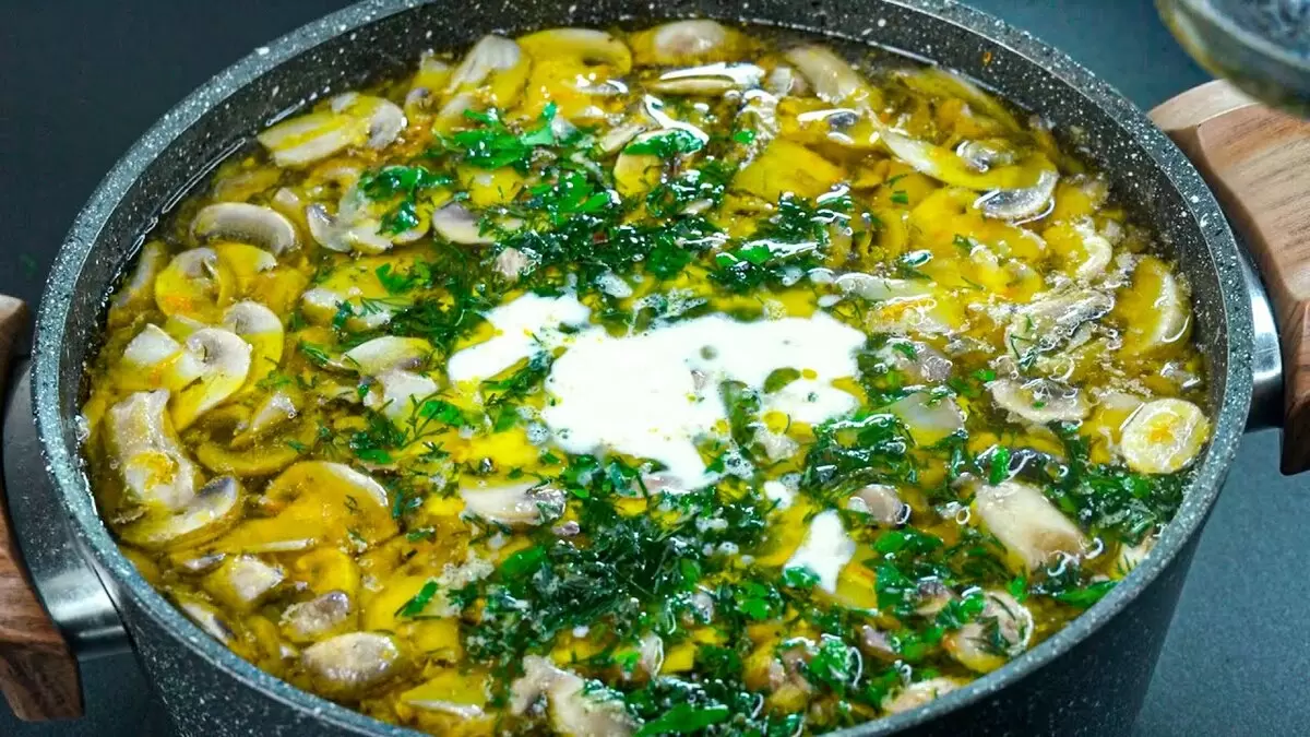 Теперь в суп добавляется картофель и нарезанные грибы. Готовится на среднем огне с периодическим перемешиванием. Через 10 минут следует добавить измельченный чеснок, соль и специи, а также зелень.